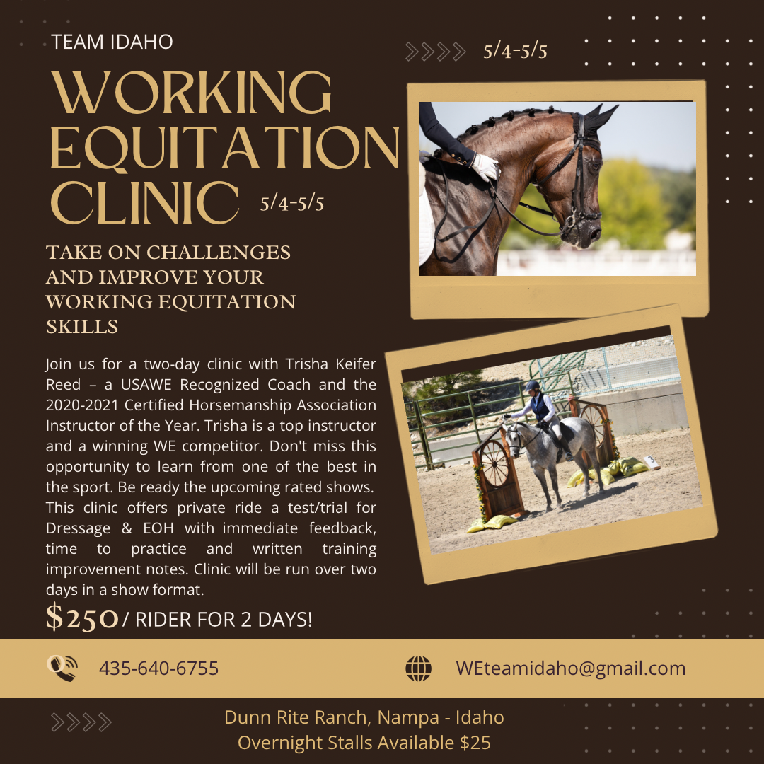 (24-022) Spring into WE in Washington Visit usawe.org > Competitions > List of Licensed Competitions for license status, performance levels offered, show manager, judge and technical delegate info.