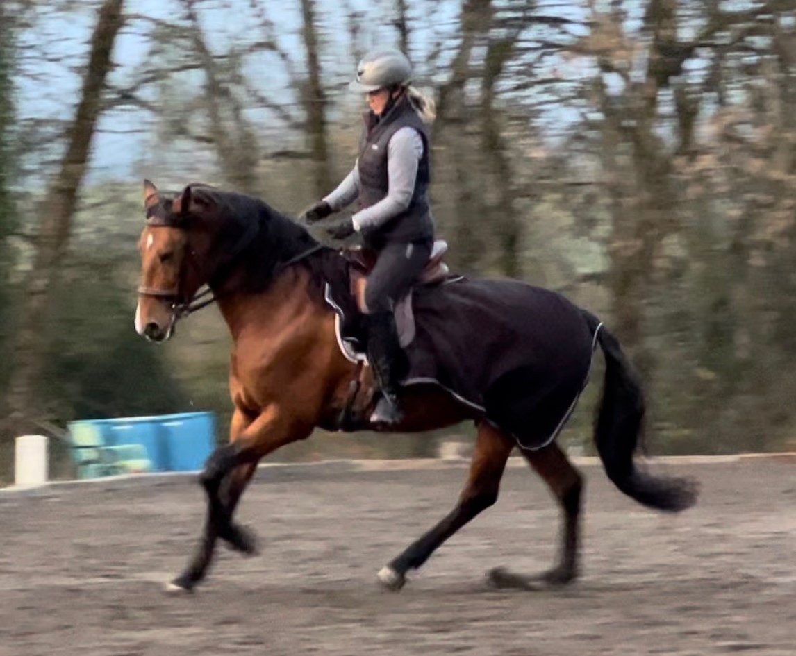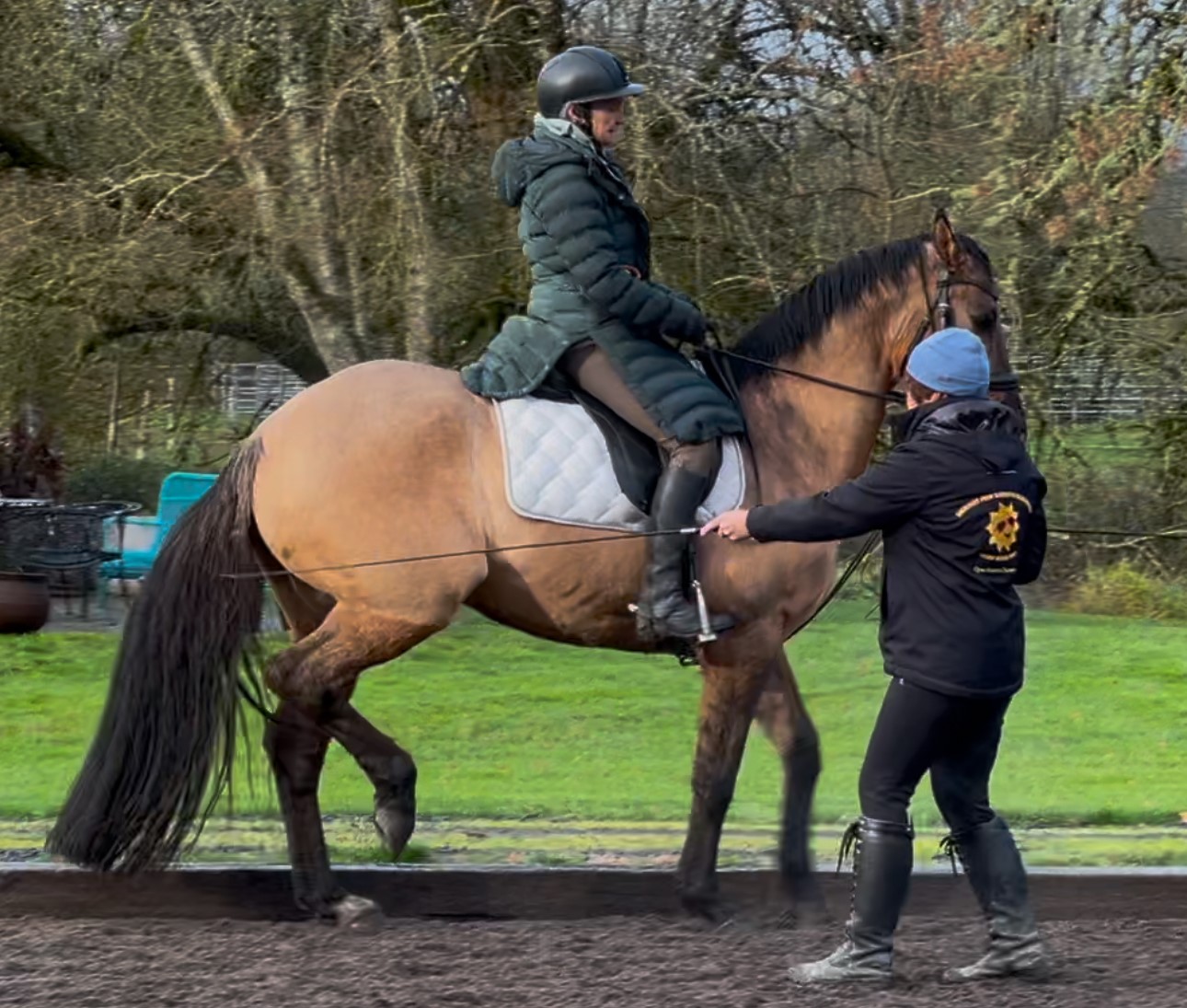 Sara Mackenzie riding George while Kimberlee Barker provides aids from the ground