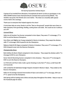 As shared by Stephanie Hayes, “It just doesn’t get any better than hanging out with the WE crowd from 10 different states, and even Canada, and all the fun people that came to volunteer.” “The biggest take away for me (Stephanie) was the highest level of horsemanship and sportsmanship that was seen at this show – riders putting their horses first. The second takeaway was how 43 competitors can bring so much food and festivities for the barn party!”